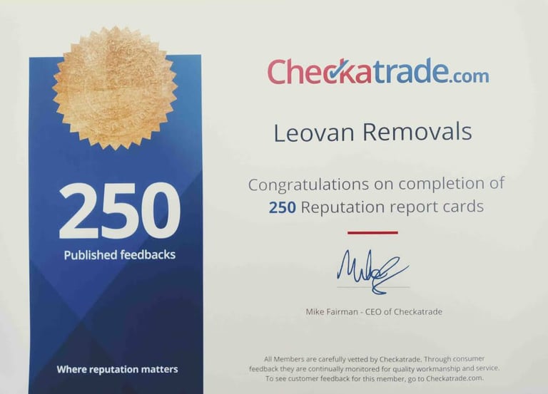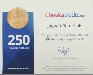 Leovan Removals has been helping families and businesses move across Surrey, Hampshire, Berkshire, West Sussex, and London for over 12 years. As a family-run company with over 250 five-star reviews, we're Checkatrade approved and fully insured for your peace of mind.